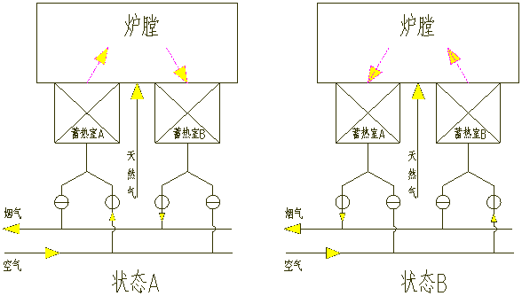 狀態(tài)B,空氣經(jīng)蓄熱室B預熱后與燃料共同進入燃燒室,燃燒產(chǎn)生的yan氣在蓄熱室A中發(fā)生熱交換后排出。